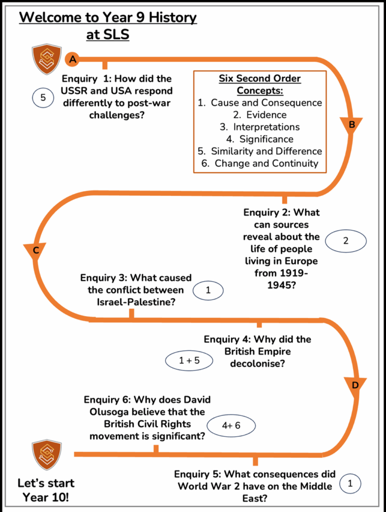 The curriculum also covers the origins of conflict in Israel-Palestine and the factors behind the decolonisation of the British Empire, encouraging students to consider cause, consequence, and significance. Students explore the British Civil Rights movement, assessing the importance of historians to modern debate – like David Olusoga. Finally, they investigate the consequences of World War II on the Middle East, linking local events to broader global changes.